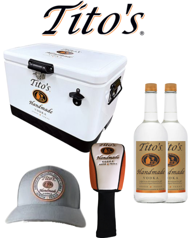 Tito's cooler, 2 bottles of Tito’s and a collection of golf-related items!